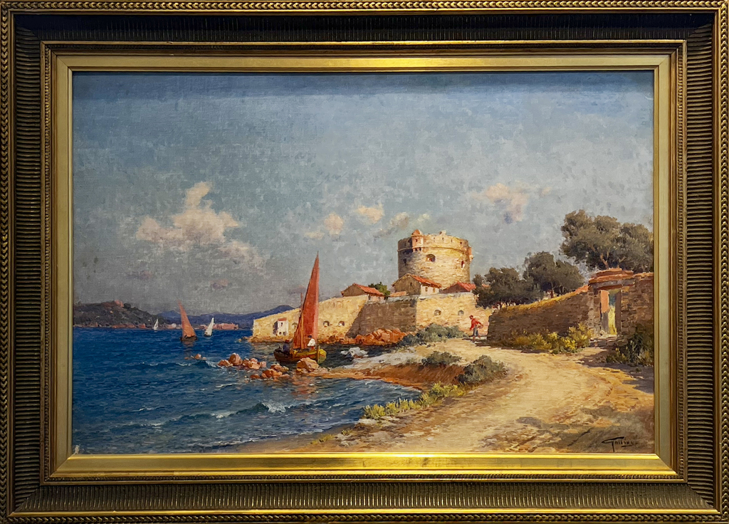 « Dans ce paysage mi-urbain mi-naturel, ciel et mer ont une place de choix. Courdouan décrit avec réalisme les mœurs au XIXe siècle ou pêcheurs et bourgeoises se côtoient avec humilité. On reconnaît le fort Balaguier et le symbolique Palmier, reflet de l’orientalisme. Lorsqu’il peint cette toile, l’impressionnisme se joue à Paris. Le salon officiel de Paris, depuis 10 ans, refuse les toiles d’artistes impressionnistes : Cézanne, Renoir, Monet… Courdouan ignore cette révolution picturale, croit à la beauté par le souci de l’exécution, la primauté du dessin, l’équilibre de la composition. Cette toile en est l’illustration en affirmant l’identité régionale face à la centralisation et à l’innovation parisienne ». (Texte Musée du Patrimoine Ollioules)