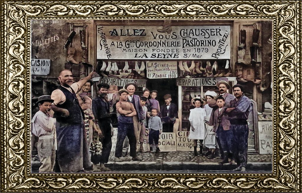 Vous êtes les bienvenus à la Grande Cordonnerie Pastorino inaugurée le 11 septembre 1910 au 31 du quai François Bernard (ex quai Regonfle, actuel quai Gabriel Péri), une maison fondée en 1879 (« Au paradis du pied »).
