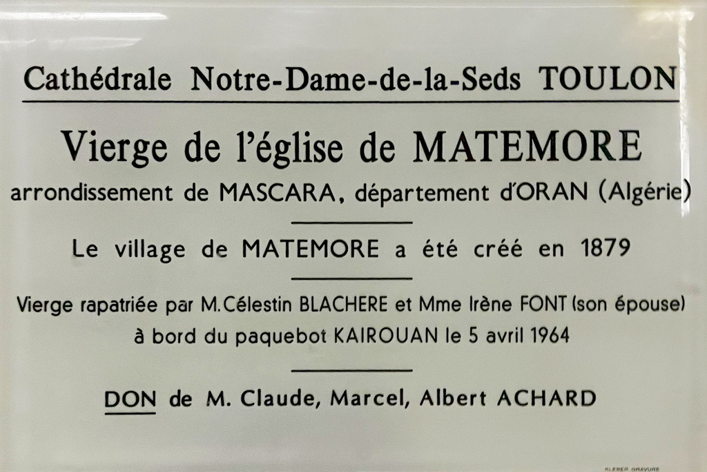 La Vierge de Matemore a élu domicile en la cathédrale Notre-Dame-de-la-Seds à Toulon grâce à un don de M. Claude Achard (in memoriam).