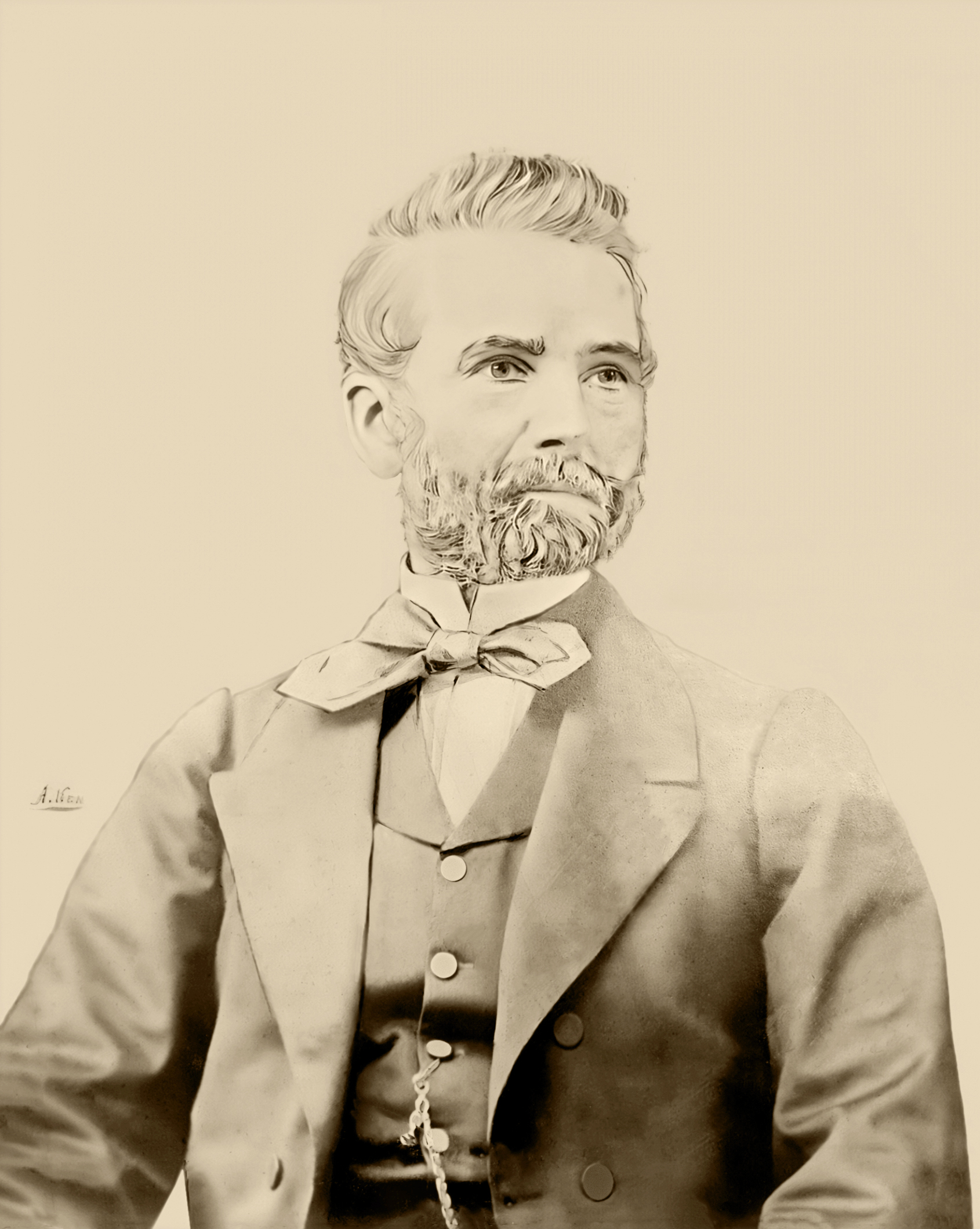 Les traces humides, les éraflures et les décolorations typiques des photos albuminées du XIXe siècle ont été ici enlevées numériquement et une version colorisée en a été faite à partir de cette version nettoyée.