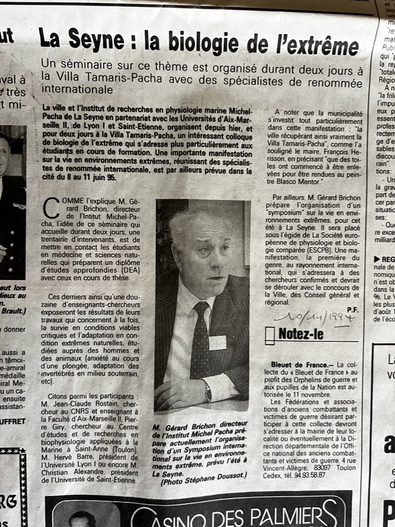 Gérard Brichon, seynois de cœur et d’adoption, vient de décéder à 81 ans. il a été le dernier directeur du laboratoire de l’institut de biologie marine Michel-Pacha, poste qu’il a occupé pendant 21 ans (1968-1989). Vous lirez sur var-matin son incroyable parcours scientifique et le combat qu’il a mené pour défendre l’institut. Il était venu assister à l’une de mes visites commentées de l’exposition sur l’aquaculture seynoise en début d’année. Modestement il avait écouté mes explications basiques sur la bioluminescence sans oser m’interrompre. Il ne s’était d’ailleurs pas présenté en arrivant mais je l’avais démasqué à son apparence, sachant qu’il allait venir. Il m’avait gentiment résumé ses démêlés avec l’université de Lyon, pour cette cause qu’il estimait juste, la préservation d’un site de recherche à Tamaris. Je garde le souvenir d’un homme humble et respectable. J’espère que son nom ira à l’une des salles du futur bâtiment annexe à l’institut, lui qui l’avait dirigé autant de temps que Raphaël Dubois…