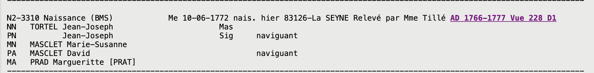 C’est le 10 juin 1772, et non 1763 comme indiqué à tort sur Internet que nait à La Seyne Jean Joseph TORTEL, fils de Jean Joseph, navigant absent, et de Marie Suzanne MASCLET, son épouse; l’acte de naissance, parfaitement renseigné, est enregistré par l’abbé PORTANIER qui procède au baptême le jour même. Sa soeur Marie Rosalie Thérèse Tortel (1777-1820) est la belle-mère de André Vincent Abran*.