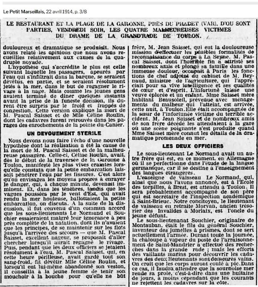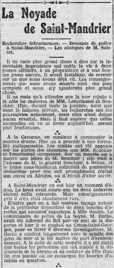 Le « Radical », qui titre « Quadruple noyade » donne l’état civil des disparus. Cette fois-ci, Céline ROULIN a 28 ans, M Pascal CESSET est marié et propriétaire à Paris, les sous-lieutenants LENORMAND et SOUCHIER sont sortis récemment de St Cyr.