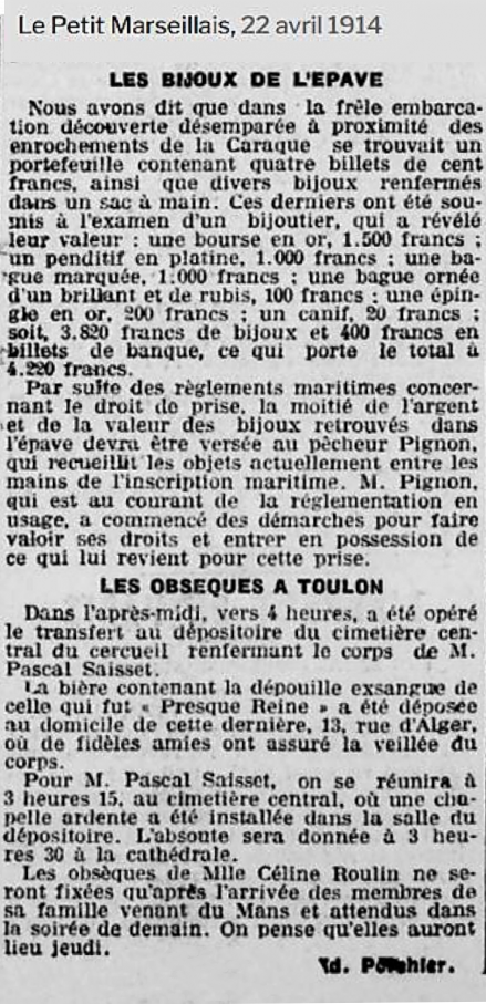 Voici les articles les plus complets du 21 avril 1914, le Petit Provençal et le Petit Marseillais :