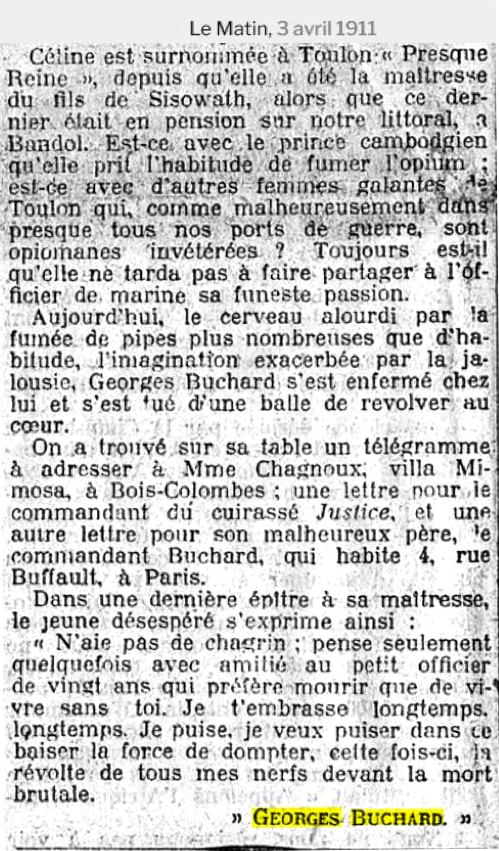 La jeune et belle Céline, une demi-mondaine bien connue à Toulon, elle était artiste dans une revue en tournée, était surnommée « Presque reine » suite à sa liaison avec le prince du Cambodge tandis qu’il « villégiaturait » à Bandol. Un aspirant de marine s’était même suicidé pour elle de dépit amoureux, l’année précédente, « victime de l’opium » avait-on dit, un vice auquel elle l’aurait initié car, comme beaucoup de femmes galantes dans tous les ports de guerre, elle était une opiomane invétérée.