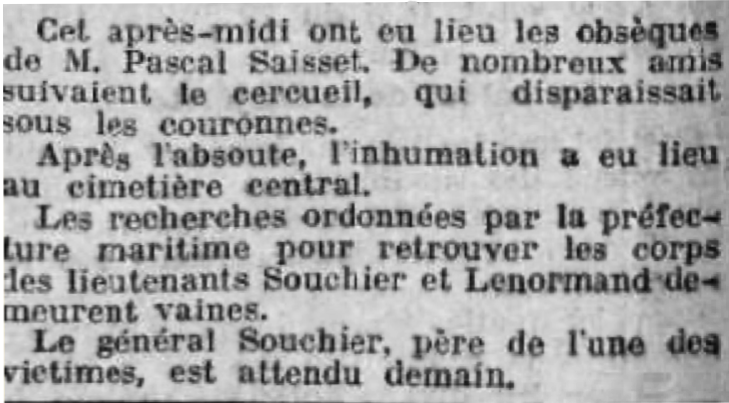 L’article nous apprend également que le sous-lieutenant SOUCHIER était le fils d’un général, inventeur de jumelles à prismes et que M. Paul SAISSET était attaché au cabinet de M. RAYNAUD ministre de l’agriculture et que son corps a été reconnu par sa famille qui habite Toulon.