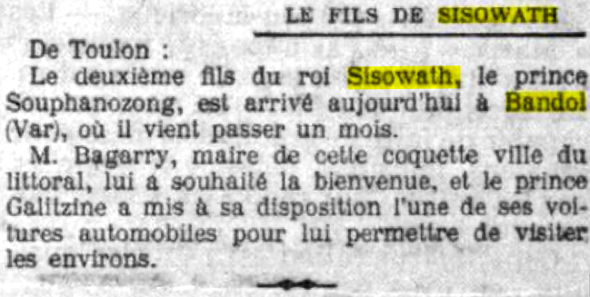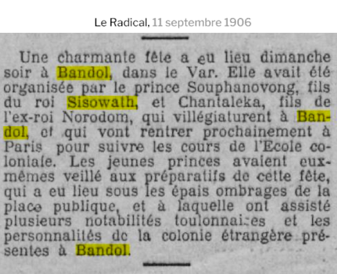 En 1906 le Petit Parisien, le Radical ou le Grand National indiquent l’arrivée du fils du Roi du Cambodge à Bandol :