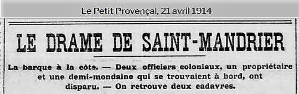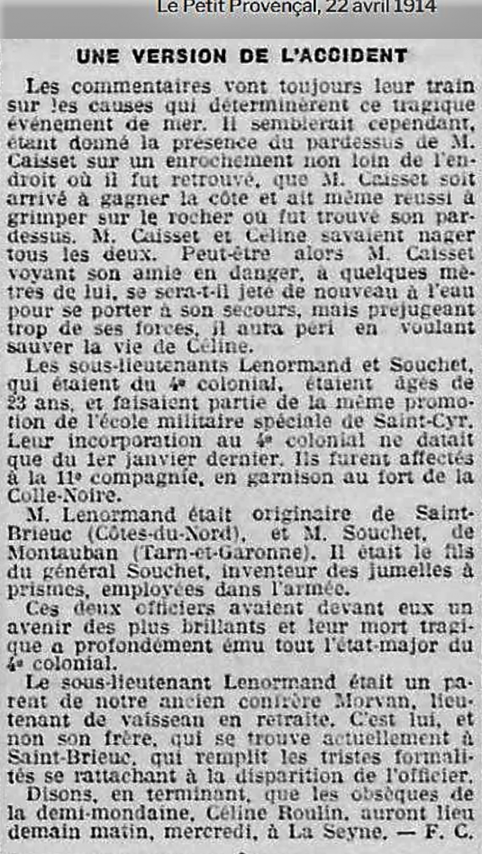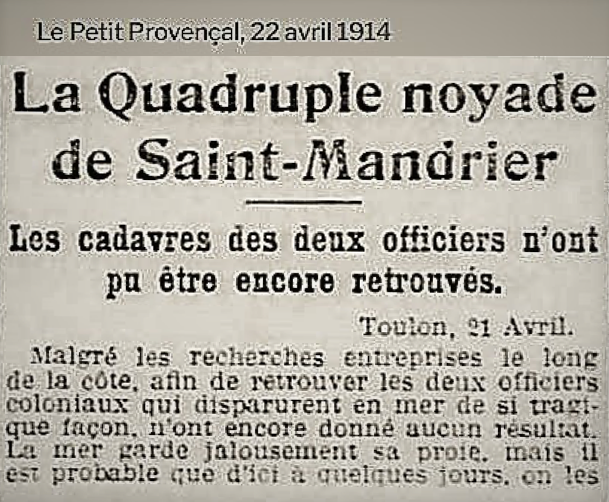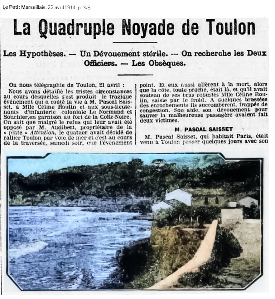 Pour « L’Homme Libre », le sous-lieutenant SOUCHET et le lieutenant LENORMAND étaient partis de la Colle-Noire pour Toulon, à 11h du soir, en compagnie de M. CESSET, rentier, et d’une demi-mondaine, Céline ROULIN. La barque chavire, quatre noyés.