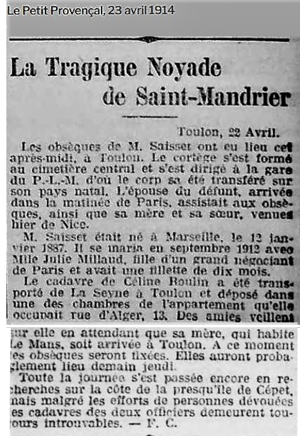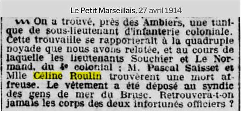 Pour « le Temps », qui titre « Disparus en mer », c’est un pêcheur de St Mandrier qui aperçoit la barque à la dérive. Il y trouve des vêtements de femme et d’homme, un portefeuille avec des billets, un sac à main avec des bijoux et une carte adressée à « Melle Céline ROULIN, 13 rue d’Alger, Toulon ».