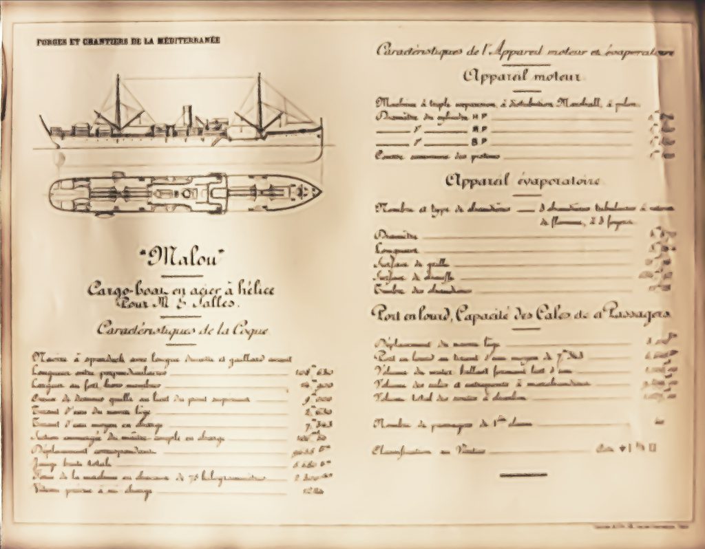 « Cargo mixte lancé en 1903 pour le compte de la Compagnie Eugène Salles de Marseille sous le nom de Malou. Chantier numéro 970.