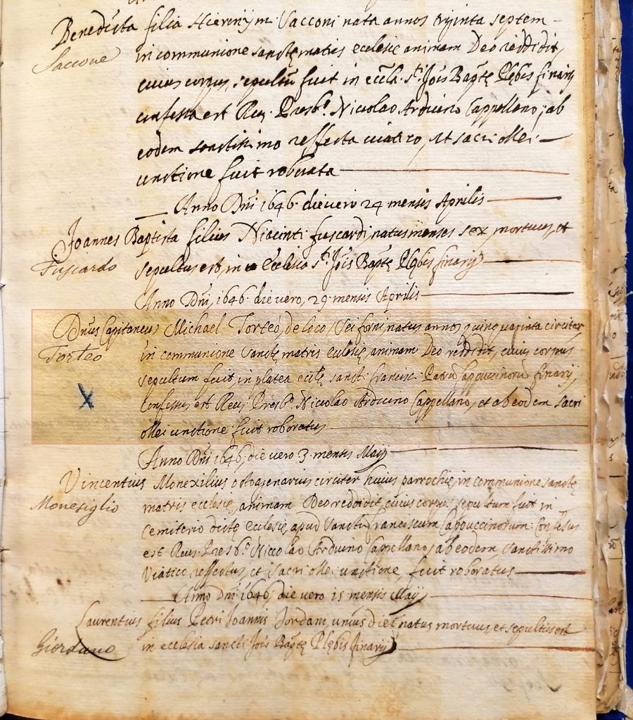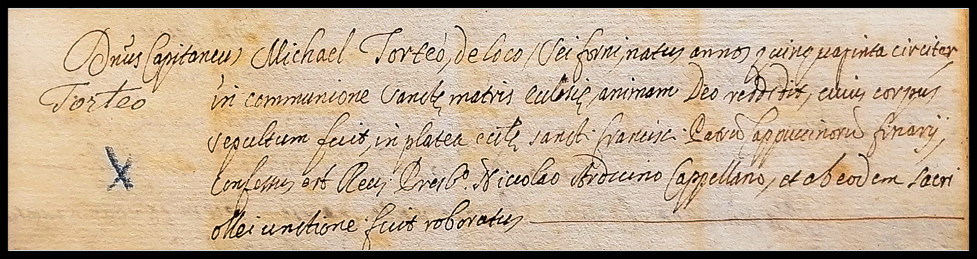 Capitaneus Michael Torteo de loco Sei Forni, natus anno quinquaginta circiter in communione sanctae matris ecclesiae animam Deo reddidit, ejus corpus sepultum fuit in platea ecclesiae Sancti Francisci Pat. Cappuccinorum Finariae, confessus est Rev. Presb. Niccolao Arduino Cappellano et ab eodem sacri olei unctione fuit roboratus.