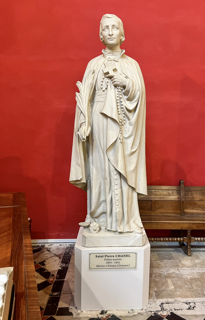 Saint Pierre Chanel, né le 12 juillet 1803 à Cuet dans la commune de Montrevel-en-Bresse (France), était un prêtre catholique mariste, missionnaire et martyr. Issu d’une famille modeste de huit enfants, il montra dès son jeune âge une grande piété et intelligence, ce qui l’amena à être remarqué par son curé local. Membre de la Société de Marie, il fut ordonné prêtre en 1827 et se consacra à l’évangélisation, notamment en tant que premier missionnaire catholique à Futuna dans le Pacifique en 1837. Il y convertit le roi et plusieurs habitants, mais fut martyrisé le 28 avril 1841 par un opposant.