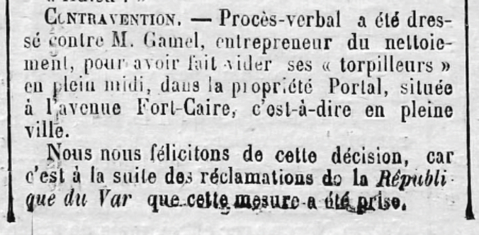 Ce personnage, Joseph Francois fortuné Gamel (1856-1938) est souvent cité dans la presse locale, principalement pour des négligences dans le service et l’inobservation du cahier des charges (défaut de ramassage d’ordures dans un quartier, oubli de nettoyage de ponceaux, etc) ou bien pour des accidents de tombereau dont le cheval s’était emballé. « Le Petit Var » organe de presse de l’opposition locale ne manquera pas d’épingler le maire Henri Pétin le 17 septembre 1905 pour un repas au Brusc en compagnie de l’entrepreneur pour cette bombance « à tout casser » avec force champagne et bombe glacée pour Dieu sait quels petits arrangements entre amis…